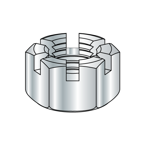 Slotted hex nuts are similar to castle nuts, but have a shallower cut slot without a rounded edge.